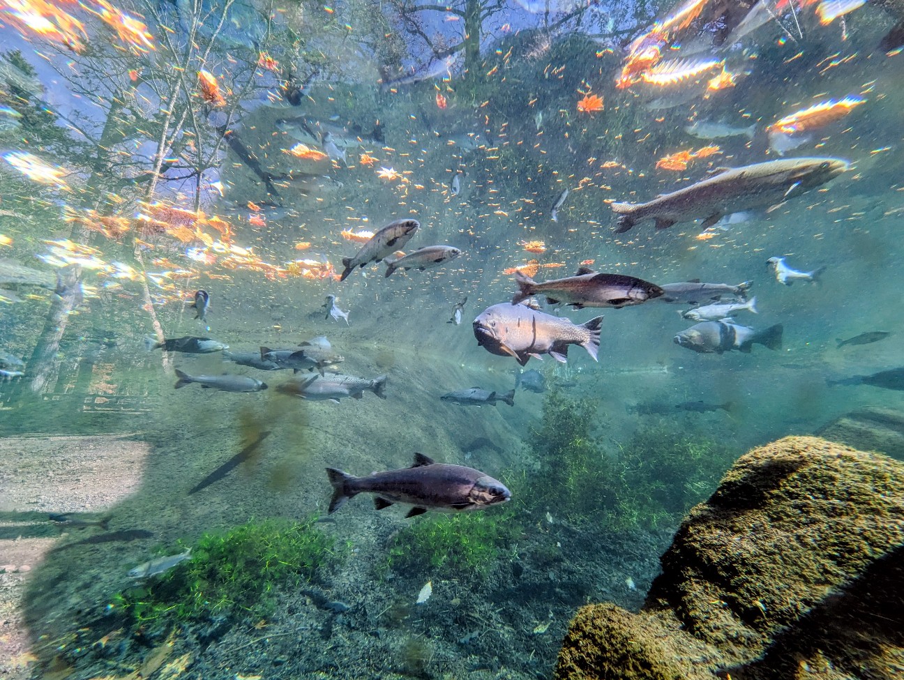 2025-12-25 バイクで訪園館:さかなと森の観察園 バイクで訪園館 水族館 訪問記録 訪問日:2022年11月5日 無料駐車場有り 淡水魚の森 門の横に駐車場がある。 ポップな看板の横に厳かな看板もある。 入ってしばらくは円筒の水槽にお魚がいる。 スチールヘッドトラウト、きみ青くてかっこいいね。 ホンマスくん。 ヒメマスにサクラマス、マス系の魚がいっぱい。 お魚がいる池もある。 奥に大きな水槽も。 お土産にトートバッグ買いました、かわいい。 他にも観光しました。 華厳の滝というやつ。 カモシカがいた。 一番綺麗で混んでる時期に行った。 ランキング参加中旅行